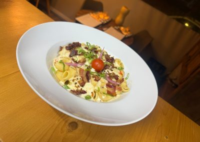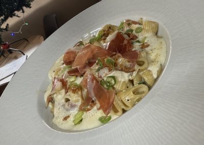 En salle, Marjolaine veille à créer une atmosphère chaleureuse et attentive, où l’on se sent accueilli comme à la maison. Ici, le service est pensé comme un lien, une continuité naturelle entre la cuisine et les convives.